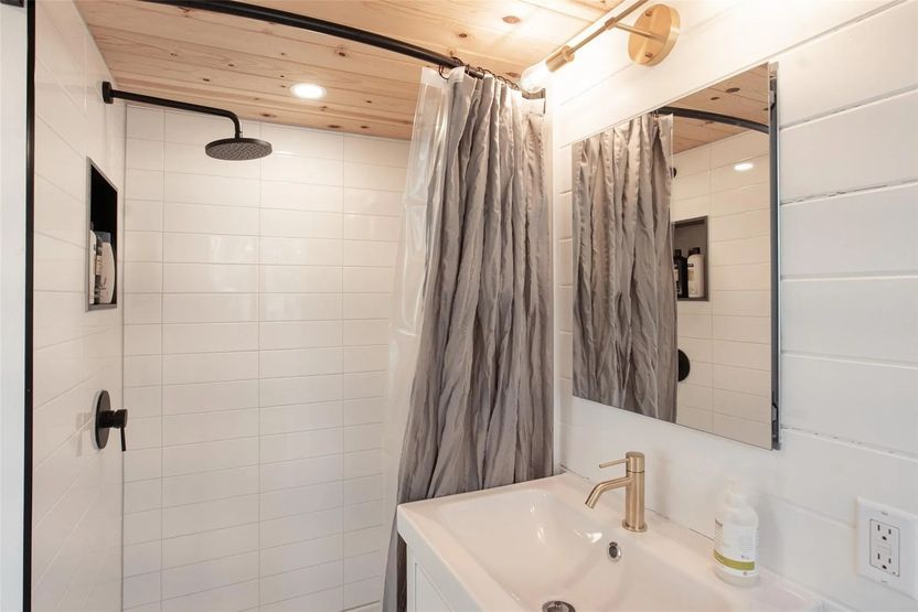 The diminutive domiciles come fully furnished. The larger units each have two queen loft beds, a stacked washer and dryer, an oven, a double-burner cooktop, and a fridge. Meanwhile, the smaller home has one queen loft bed, a washer and dryer, cooktop, fridge, and a microwave with ovenlike functionality, Roberts says.